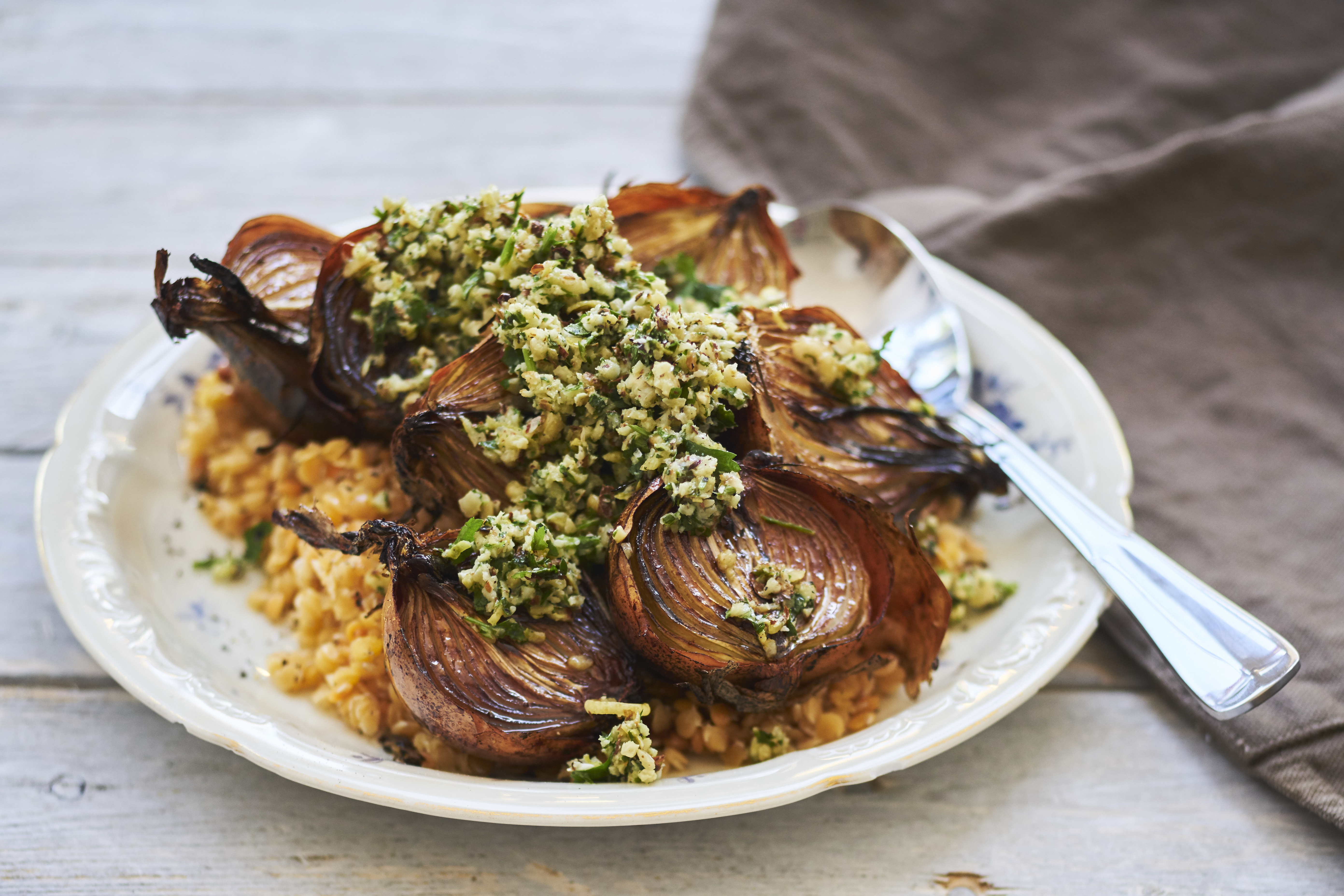 - Serveer de uien op een bedje van rode linzen en top af met de hazelnootgremolata.
