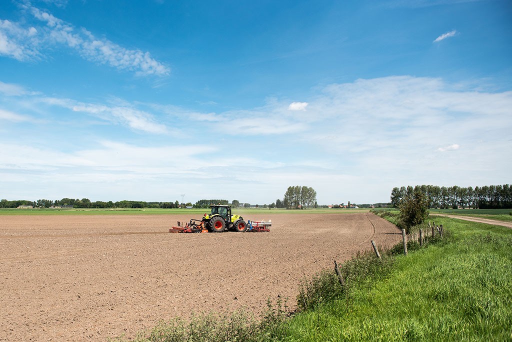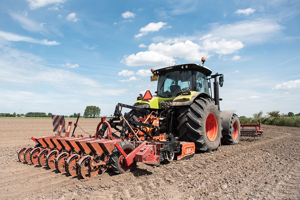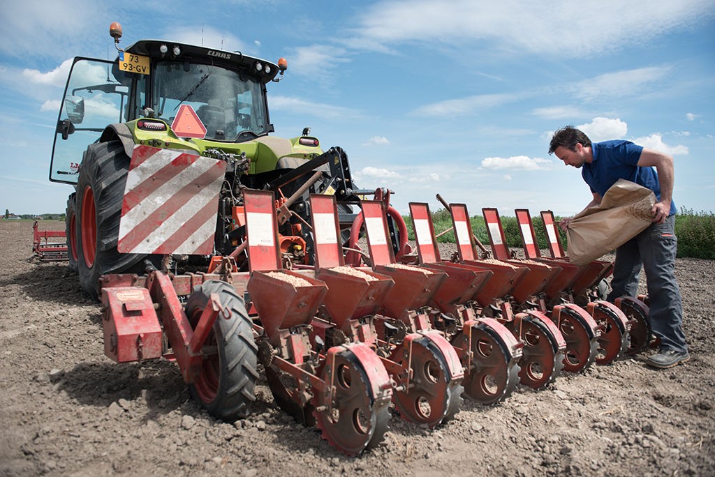 Vooraan de tractor breekt een machine de harde kleikluiten tot fijne grond en zorgt deze voor een gladde zaaiklare voedingsbodem. Achterop de tractor hangen acht bakjes zaad op een vijvendertig jaar oude zaaimachine. ‘Deze antieke machine, die mijn vader ook al gebruikte, zaait in acht rijtjes op 37,5 cm rijafstand van elkaar. Hiermee combineer ik de precisie van zowel de moderne technologie als de oude landbouwmachinerie’.