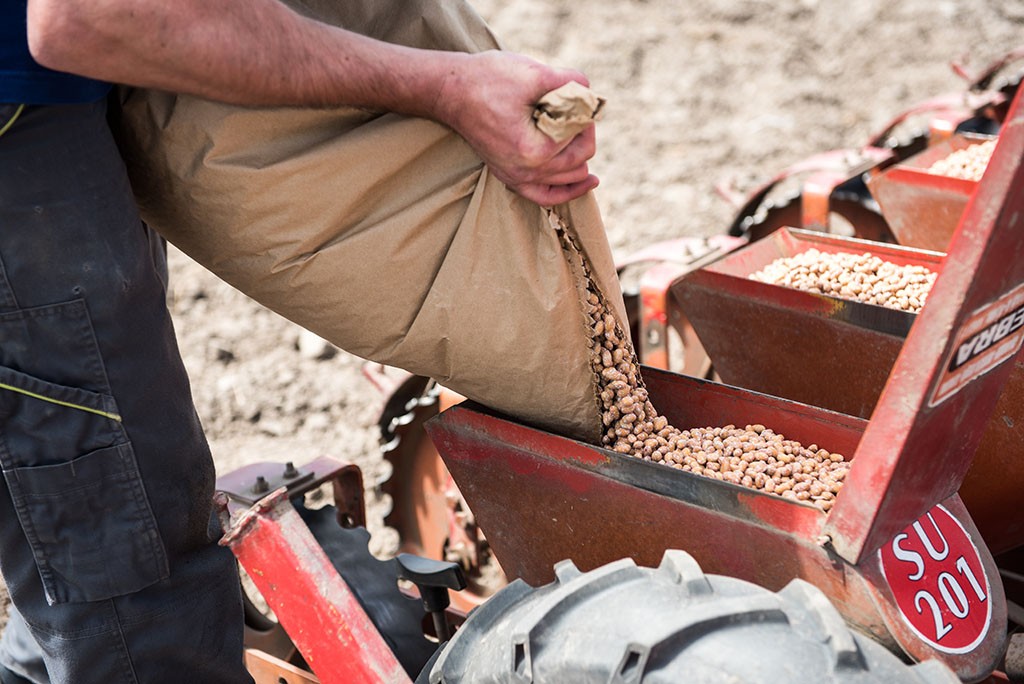 Tijdens het bijvullen van de bakjes achterop de zaaimachine, merk ik op dat de zaden niet donkerbruin zijn, maar witgestippeld. ‘Om te voorkomen dat de bonenplant wordt aangetast door de bonenvlieg laten we het zaad van tevoren bewerken met een zaadcoating’, vertelt Marijn verder. ‘Als we dit niet zouden doen, heeft de larve van de vlieg kans om gangen te boren in de kiemende zaden. Daardoor staat de ontwikkeling van de plant stil en rotten de kiemplanten weg. Ook vreten zij de groeipunten uit de kiemplantjes, waardoor verdere groei niet meer mogelijk is’.
